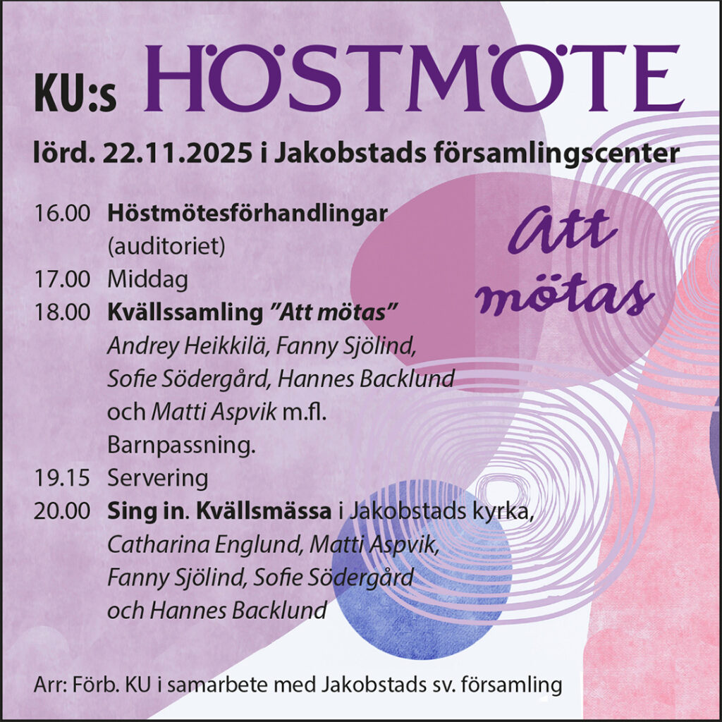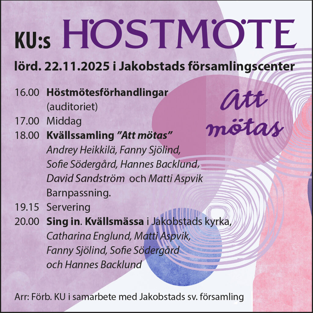 Medlemmarna och medlemskretsarna i Förbundet Kyrkans Ungdom r.f. kallas till ordinarie höstmöte lördag 22.11.25 kl. 16.00 i församlingscentret i Jakobstad. Stadgeenliga ärenden. Eventuella motioner med förslag till beslut, bör vara styrelsen tillhanda senast 7.11.25 under adress: Förb. Kyrkans Ungdom, Seminarieg. 19, 66900 Nykarleby eller kansliet@kyrkansungdom.fi.